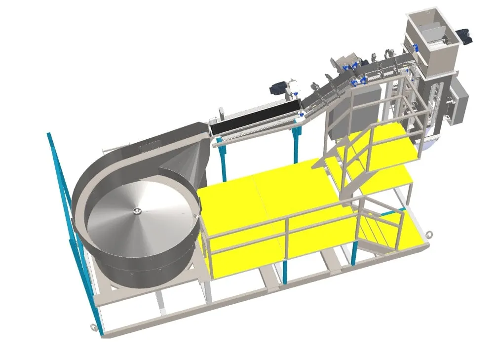 - Elevated circular feed chain to pick up aligned material with adjustable material profiler to maintain continuous single file material feed